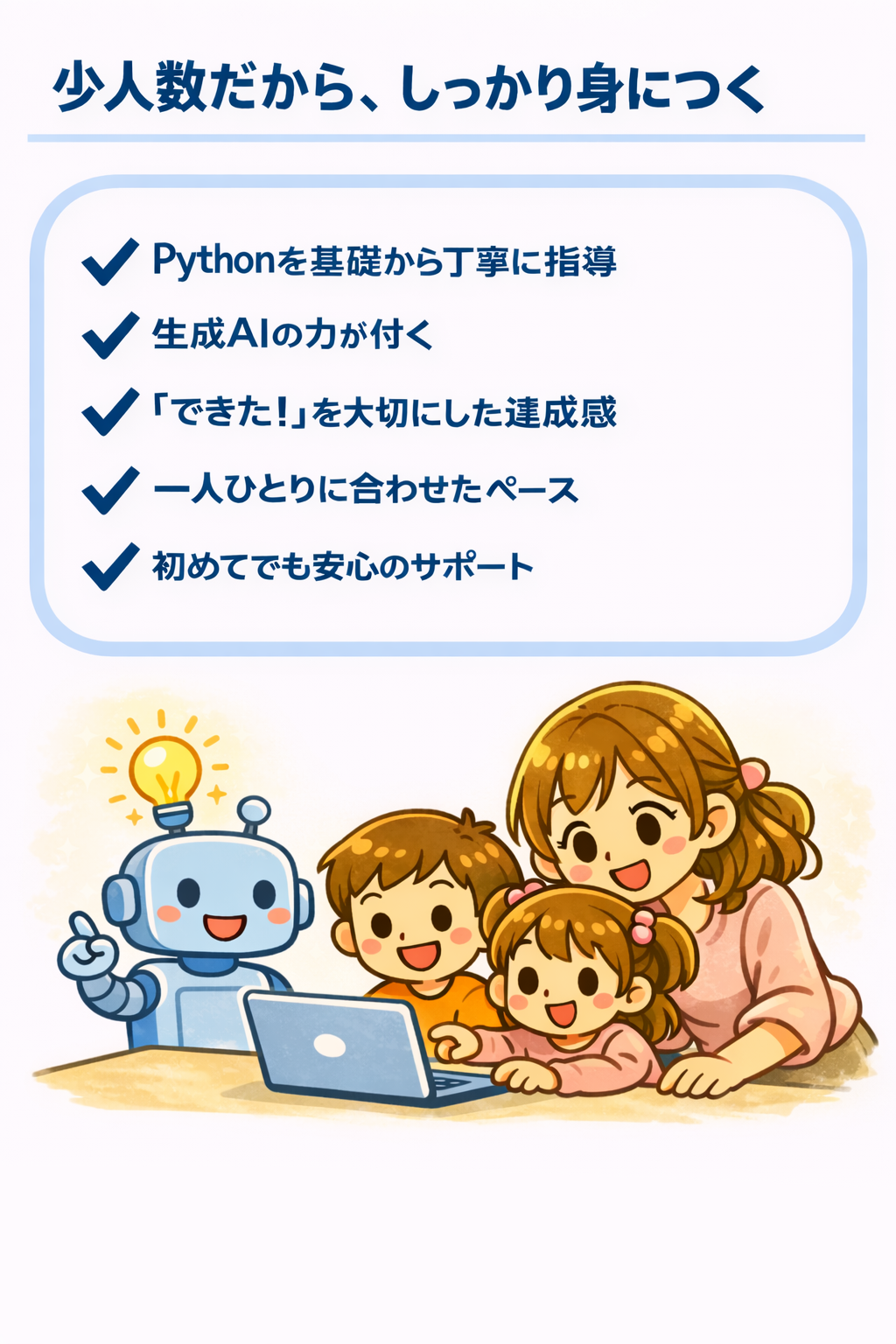 無理なく安心して学べる環境を提供し、将来のスキルを確実に身につけるサポートをいたします。